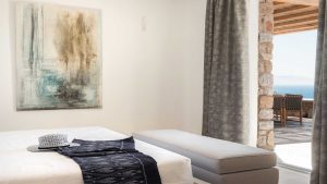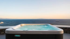 The outdoor Jacuzzi can fit up to 10 people and the spacious sunbeds provide a friendly and agreeable atmosphere. With its ideal location, the Villa is a luxury combination of privacy, sweetness, and original design. The guests will enjoy endless moments in the outdoor space but also diners in the dining room and its panoramic view to the Aegean, in one of the most prime areas of Mykonos. The villa is totally secured with a high-tech alarm system and outdoor cameras around the villa.
