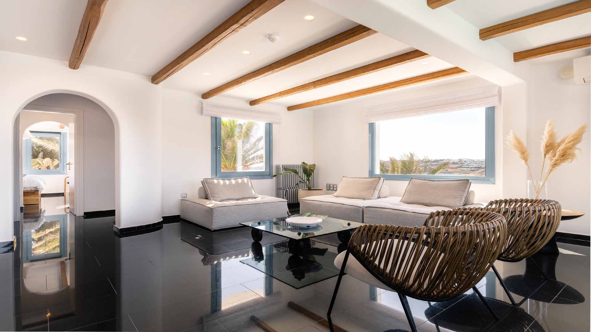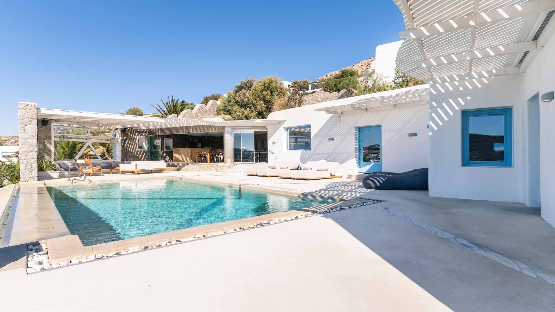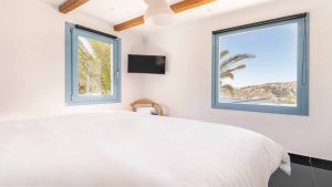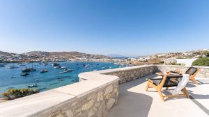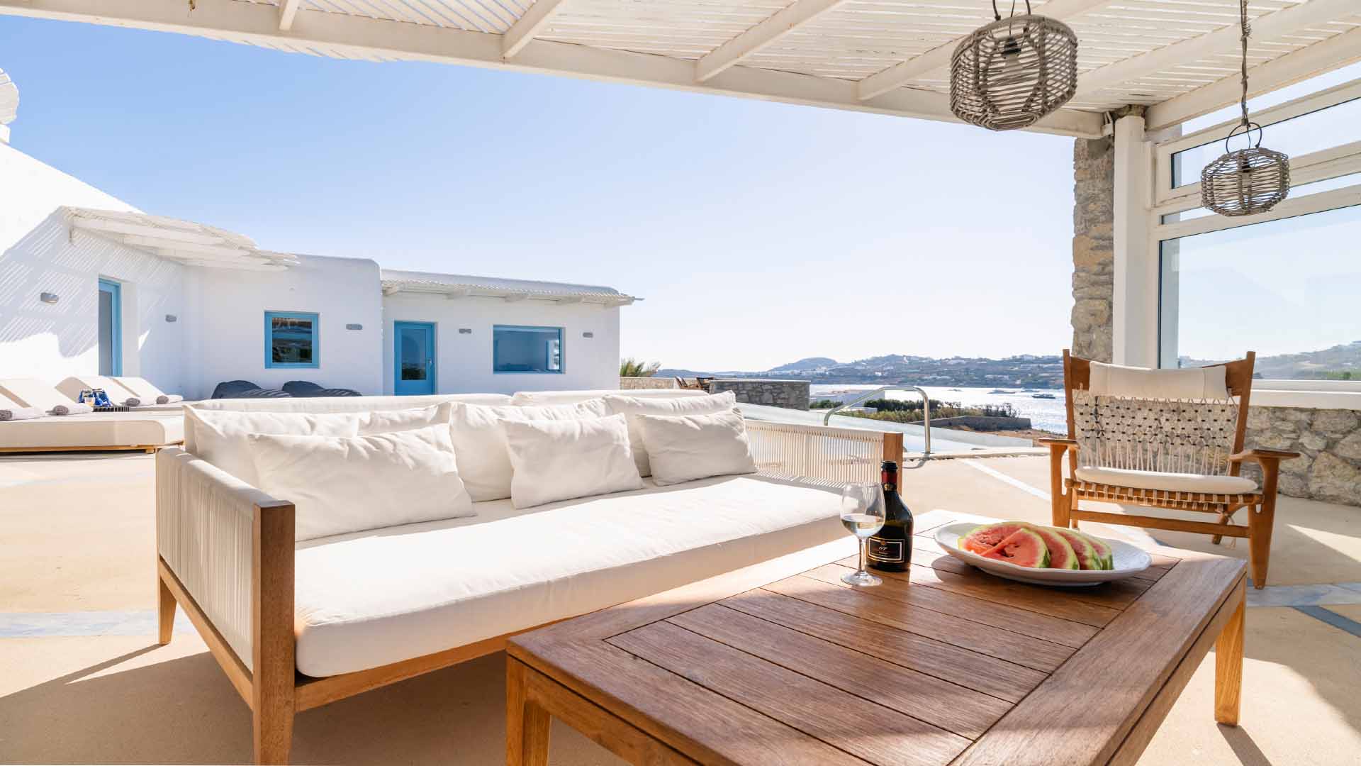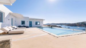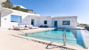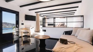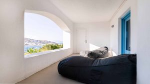 The villa is also just a short walk from Ornos Beach, renowned for its crystal-clear waters and vibrant atmosphere. Within walking distance, guests will find a variety of restaurants, cafes, and bars to suit every taste.