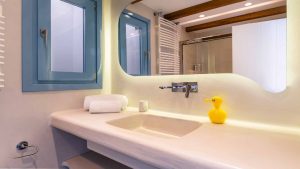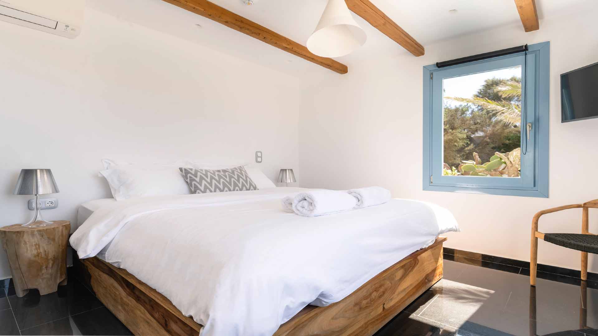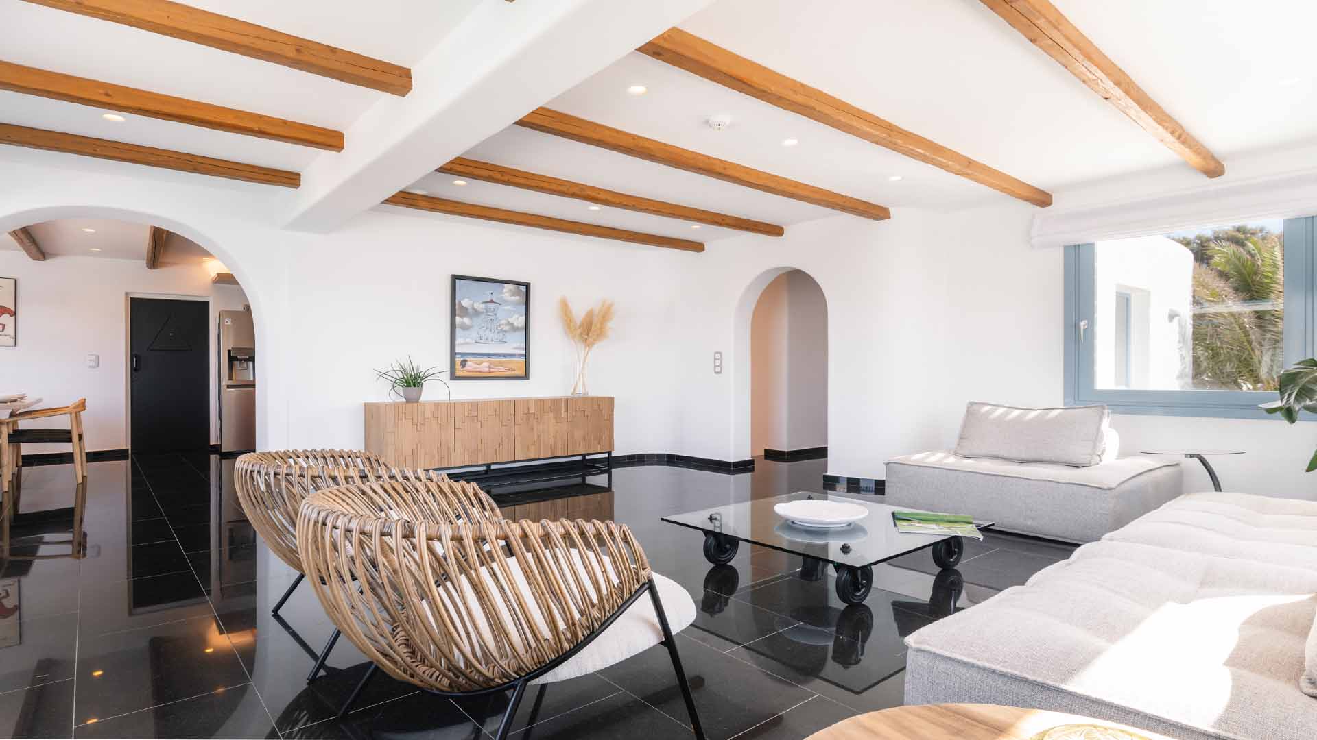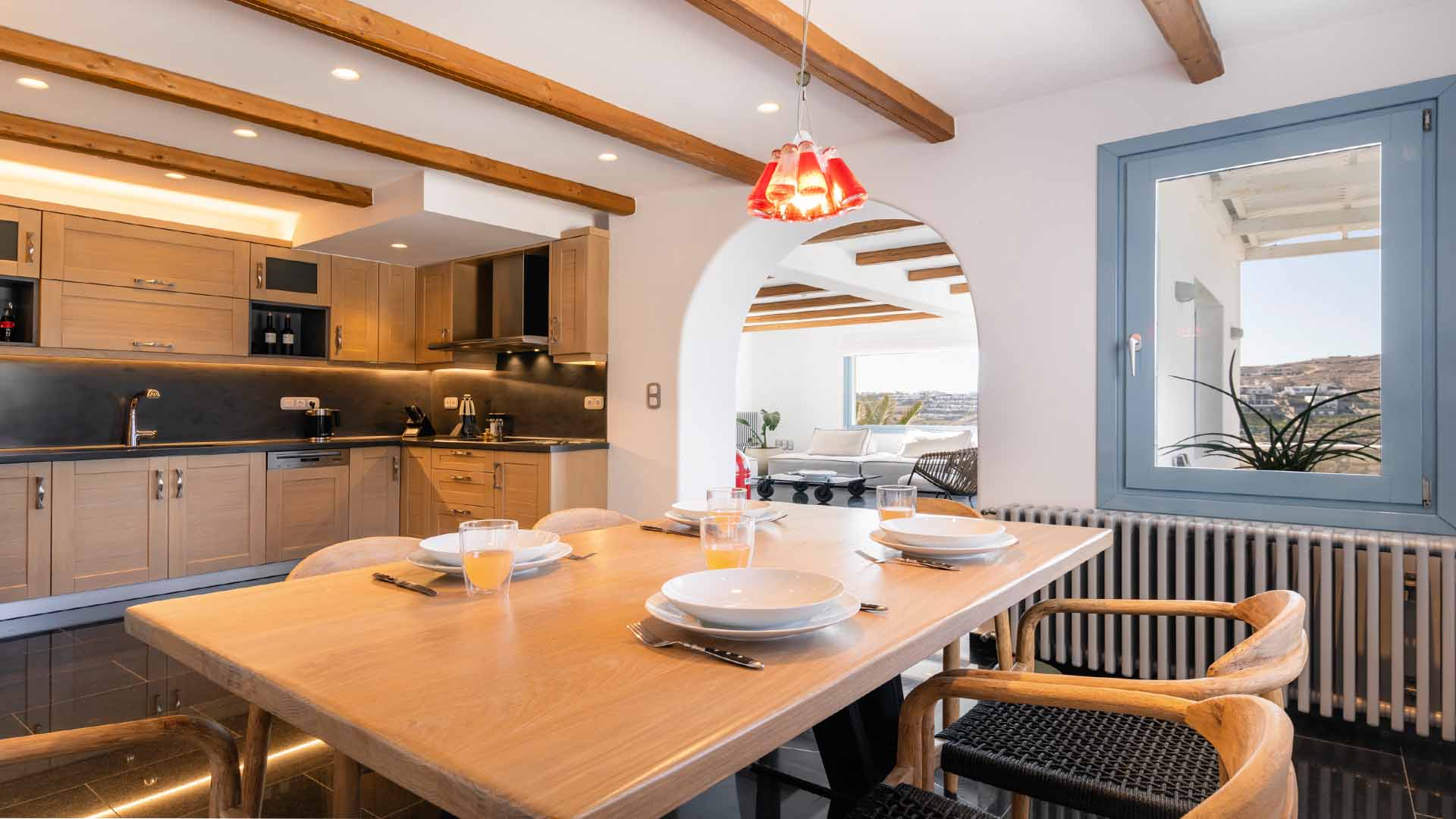 The villa is also just a short walk from Ornos Beach, renowned for its crystal-clear waters and vibrant atmosphere. Within walking distance, guests will find a variety of restaurants, cafes, and bars to suit every taste.