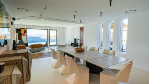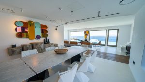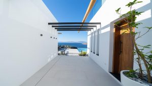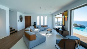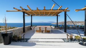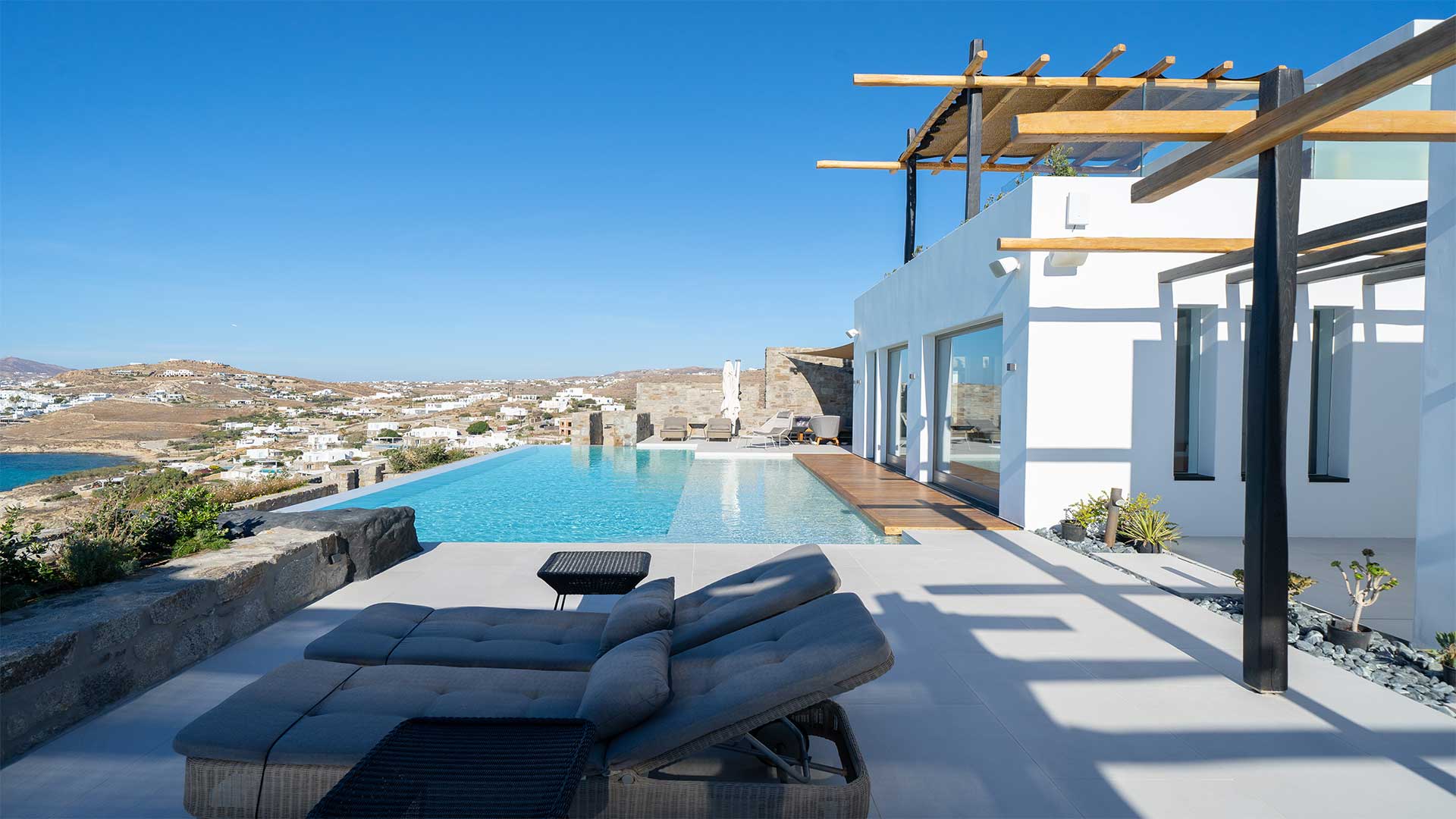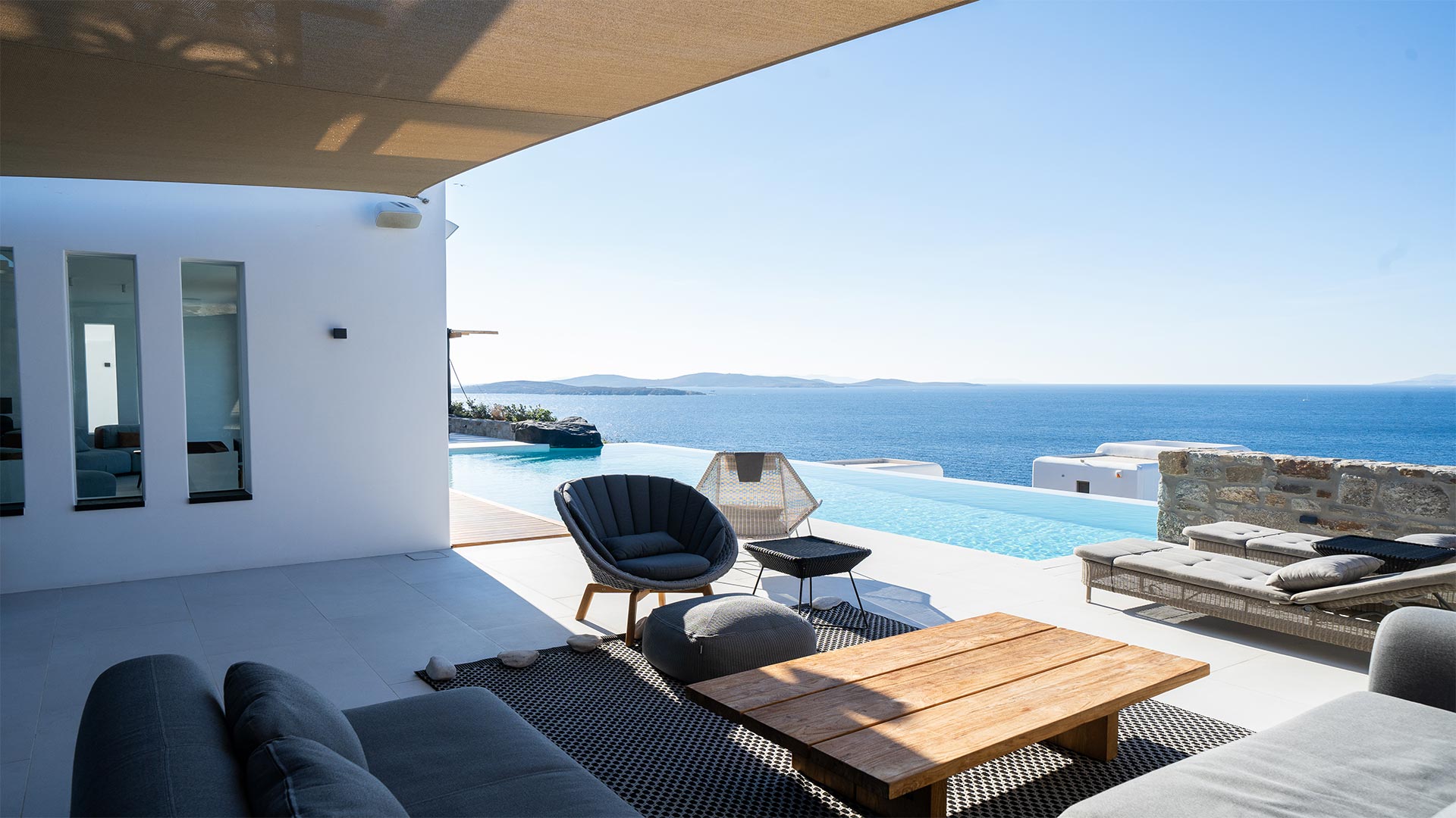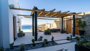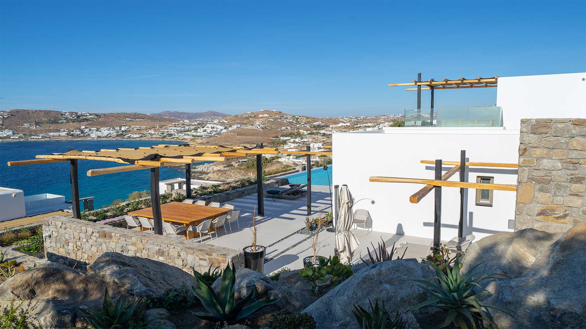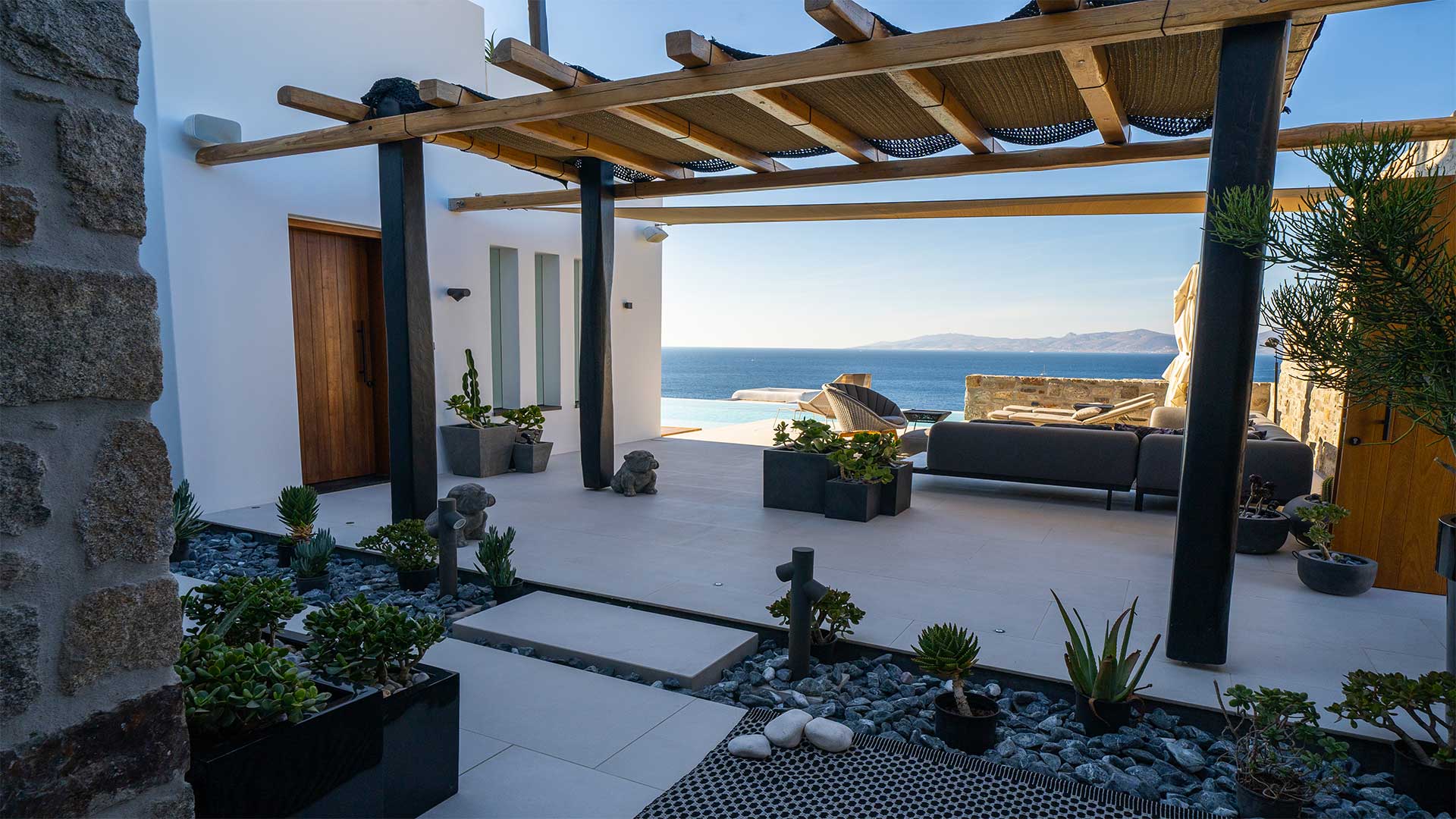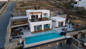 A Mykonian traditional architecture blended with modern features and infrastrusture. The result is a carefully crafted with care Karma Villa;breathes with the environment in a transparent languge of water features, stone,white & deep blue sea, Delos, Siros & the Aegean look so close.