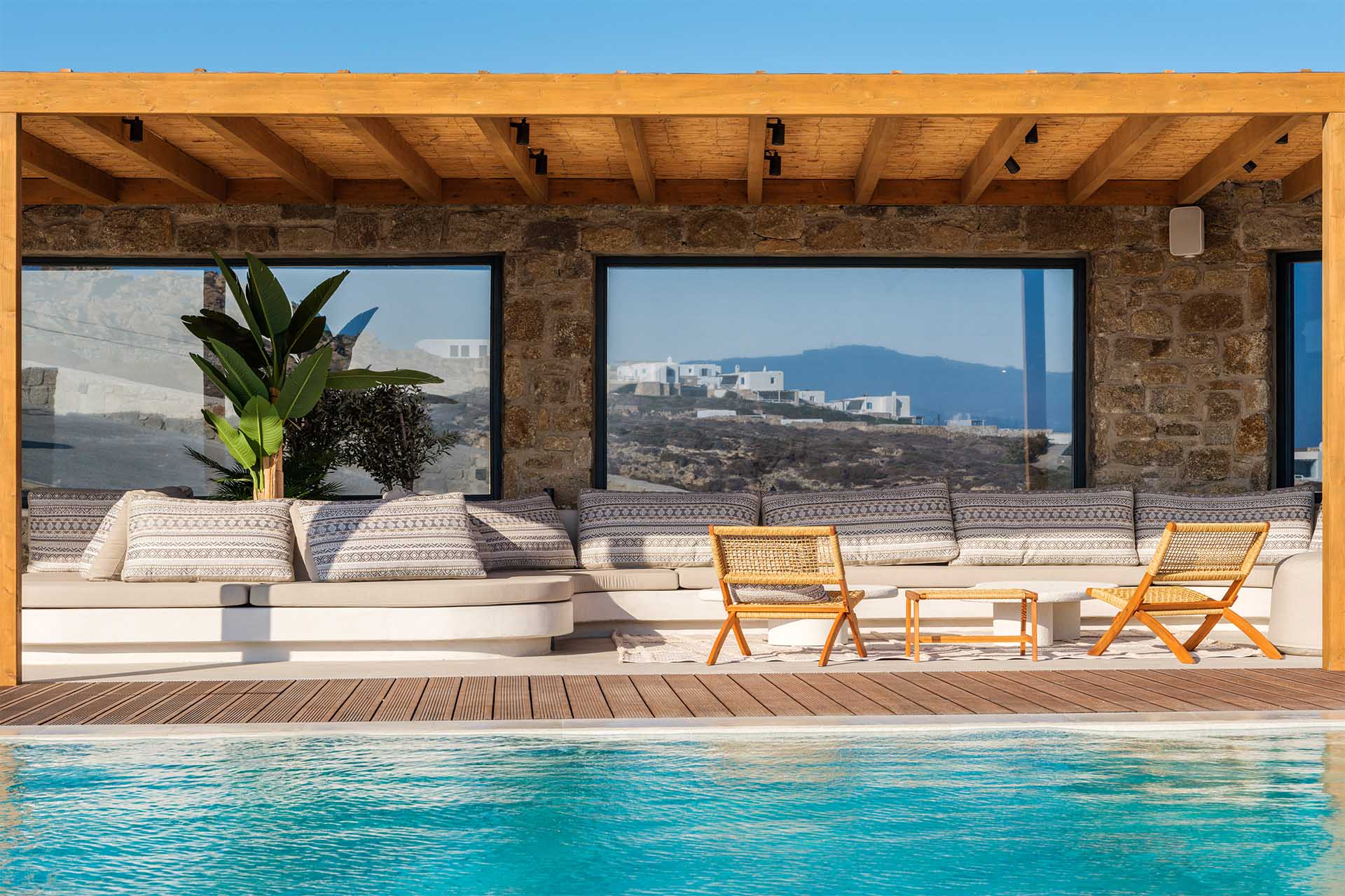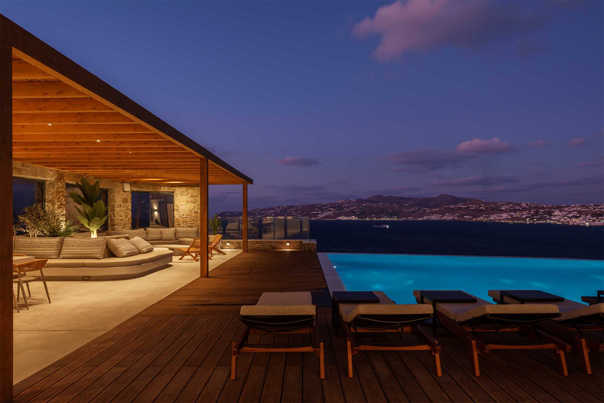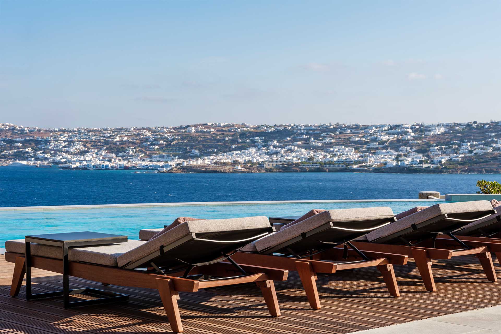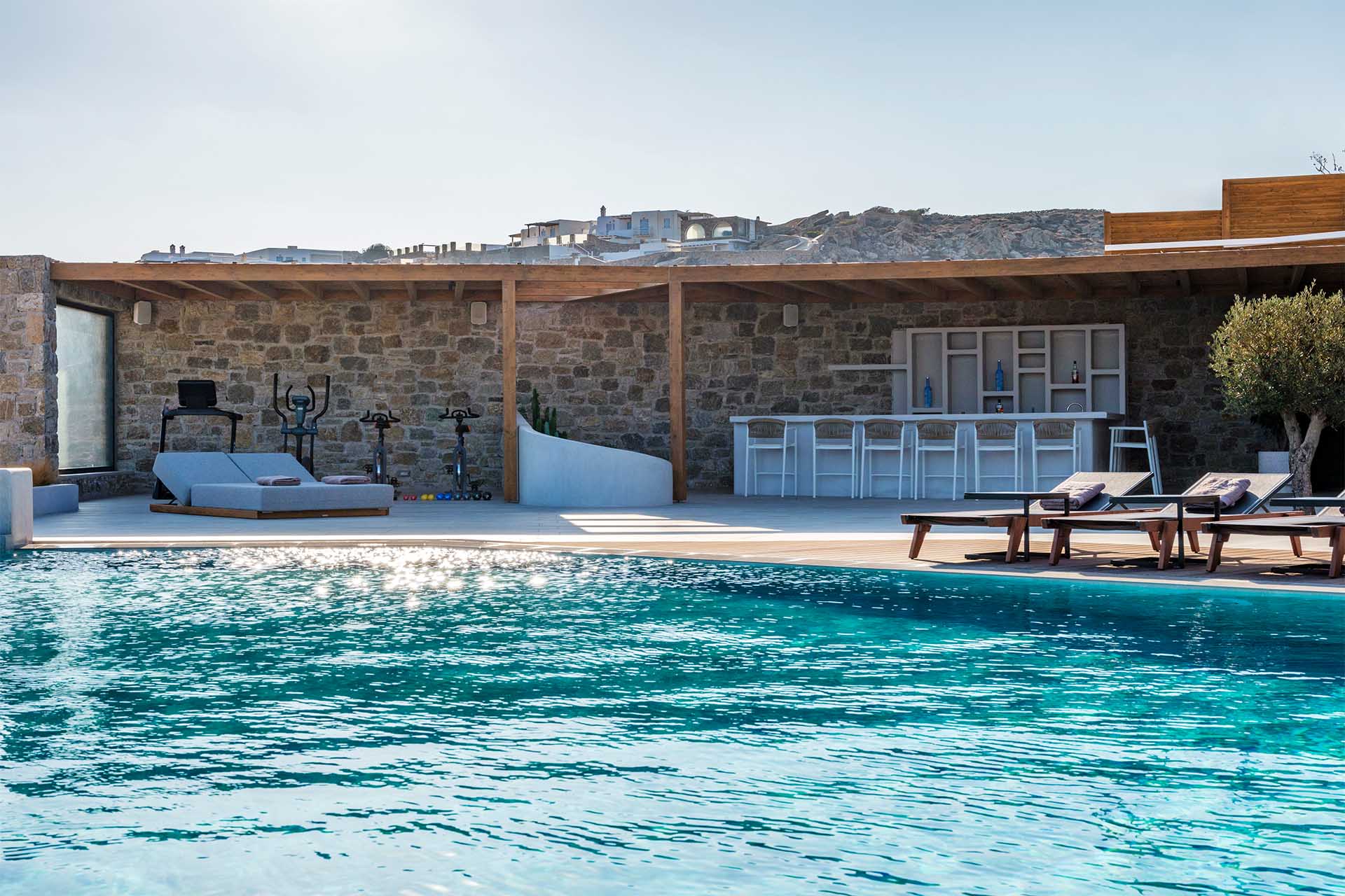 A heated infinity pool overlooks the iconic windmills, complemented by sun loungers, a lounge area, bar, and private gym. Outdoor dining and elegant relaxation spaces complete the experience.