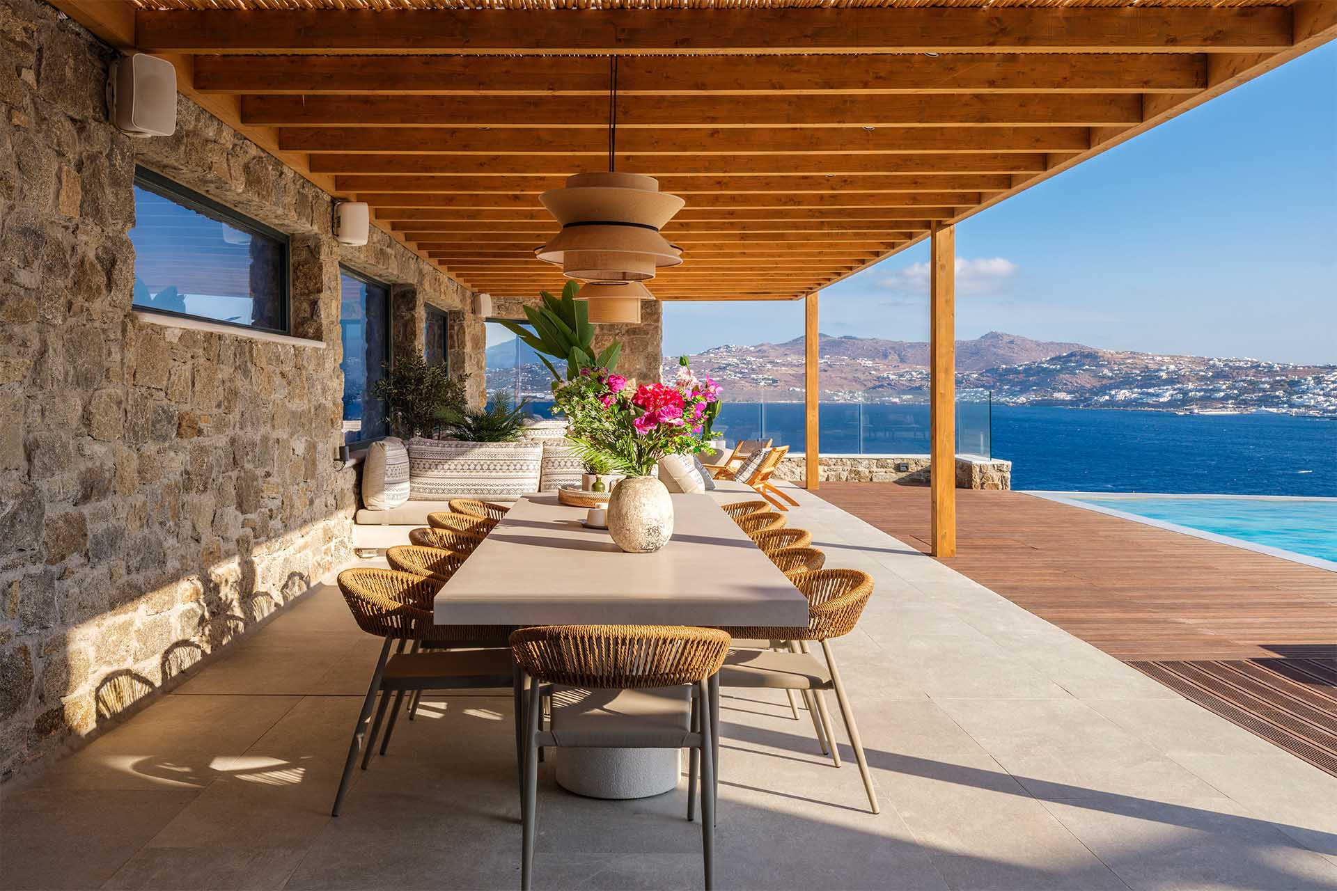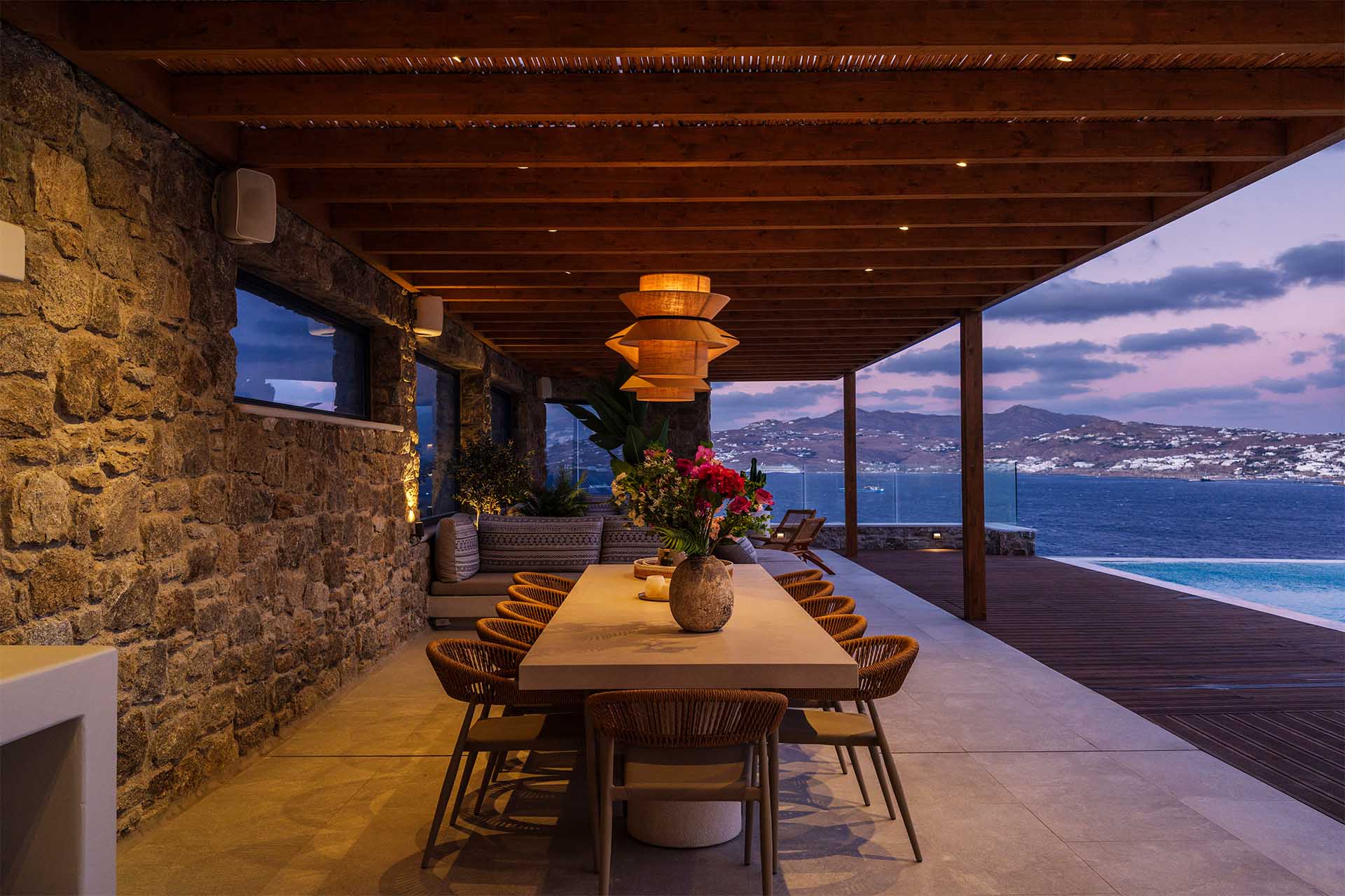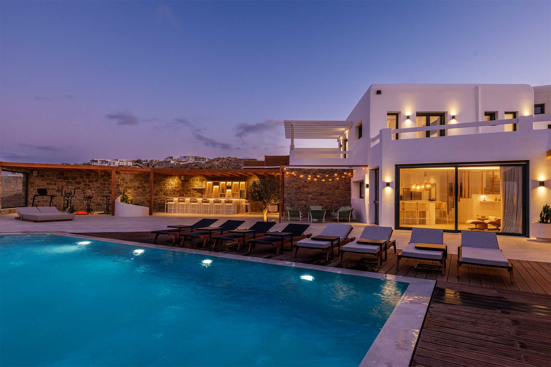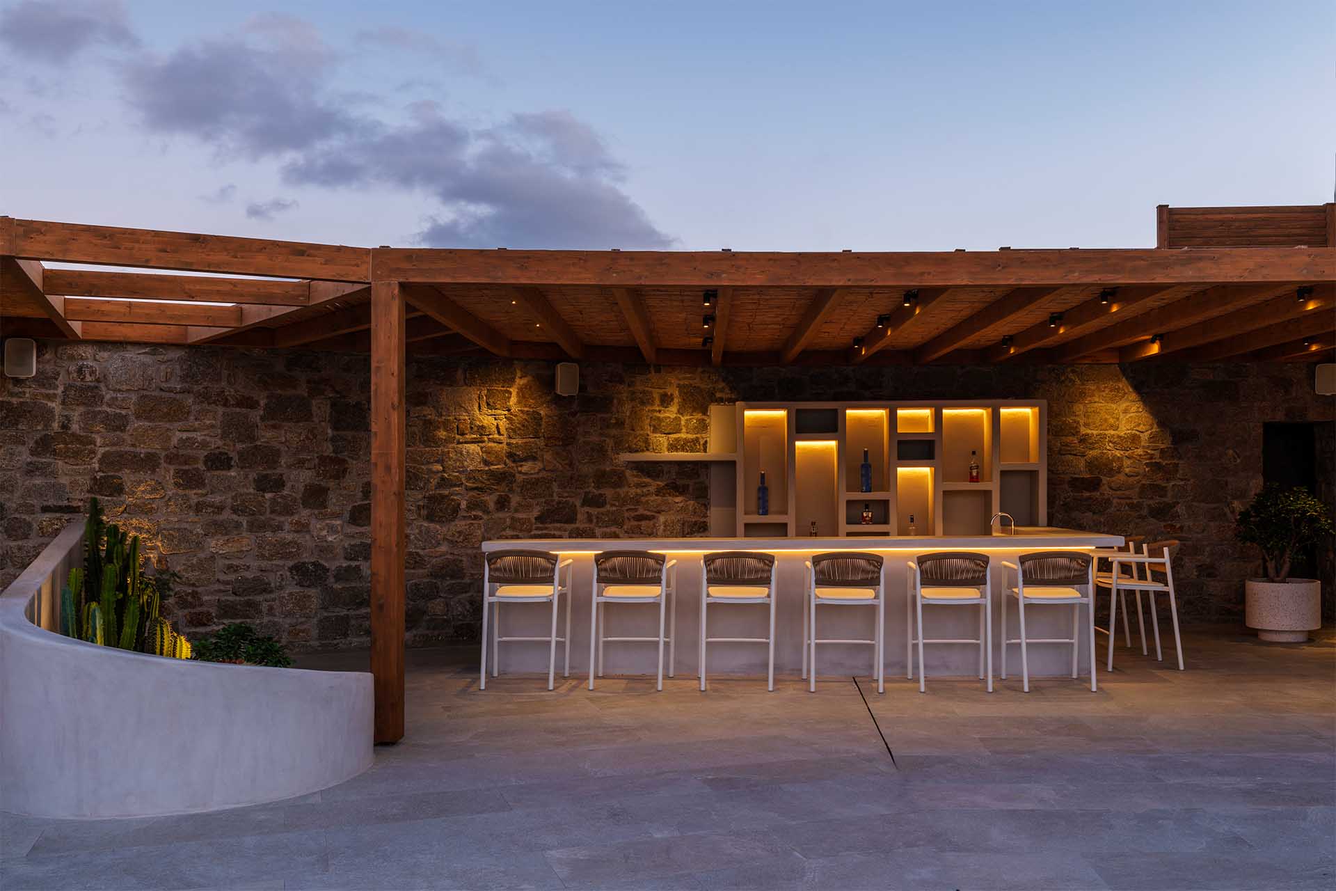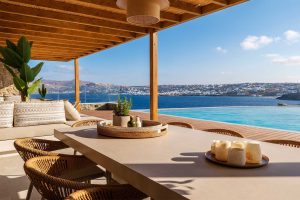 A heated infinity pool overlooks the iconic windmills, complemented by sun loungers, a lounge area, bar, and private gym. Outdoor dining and elegant relaxation spaces complete the experience.