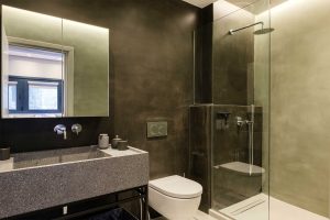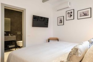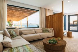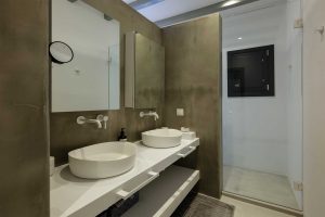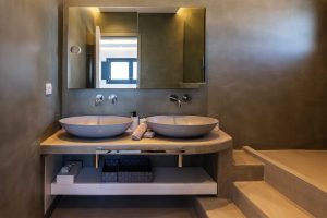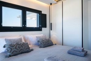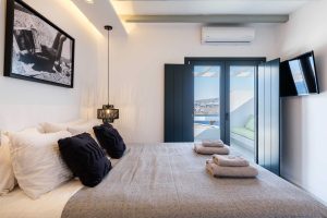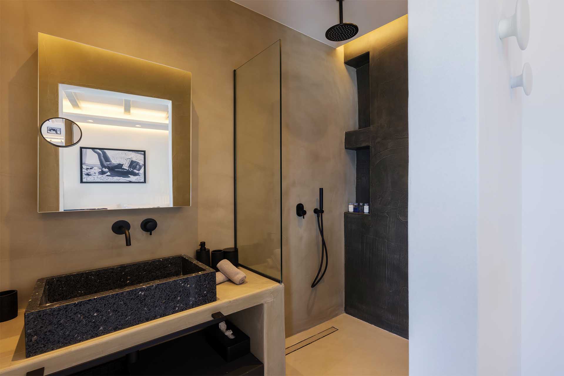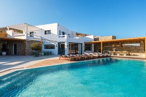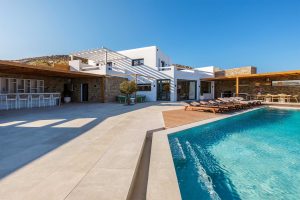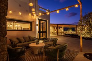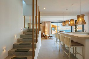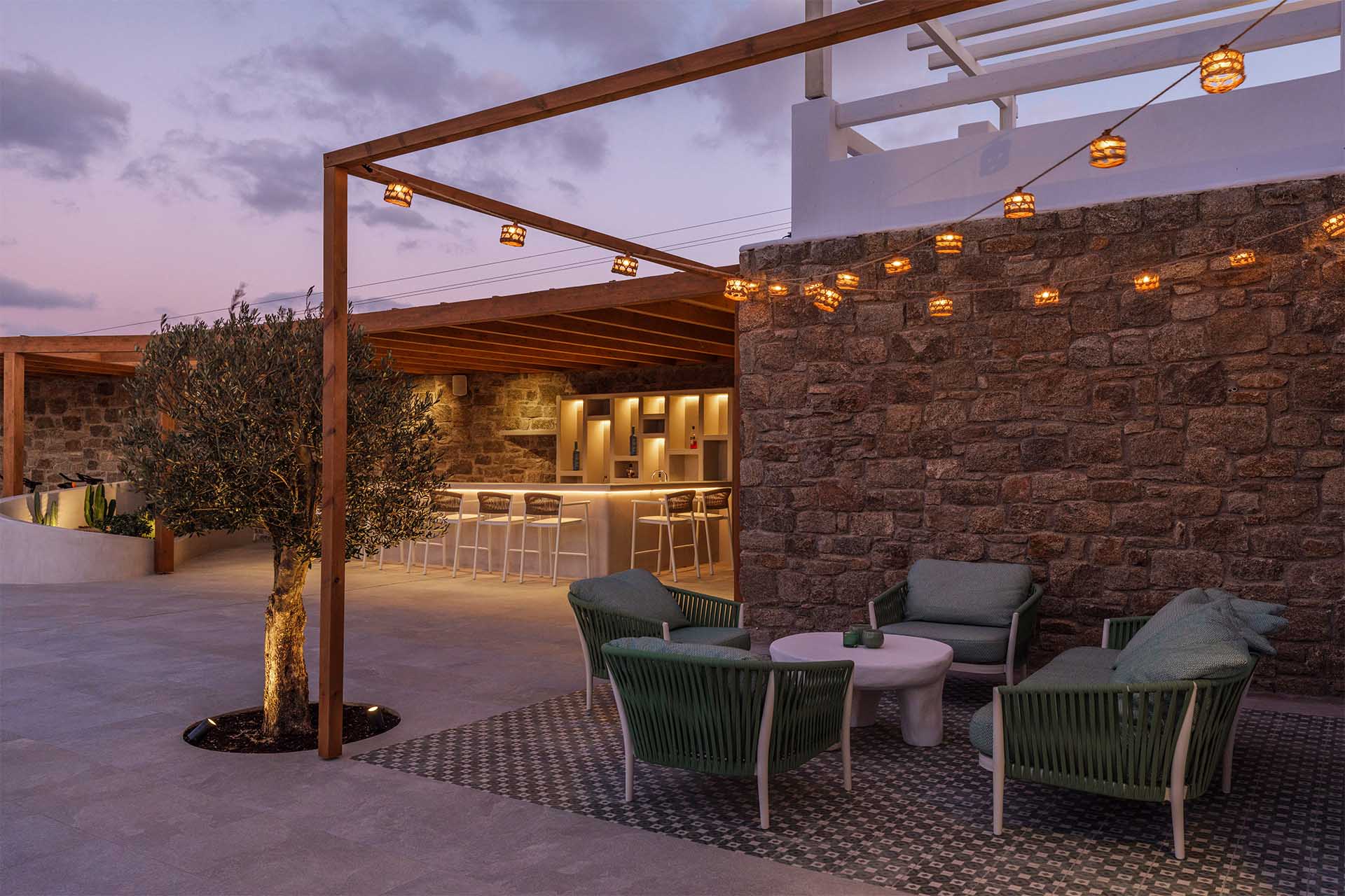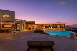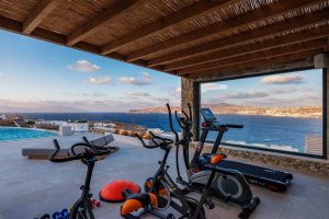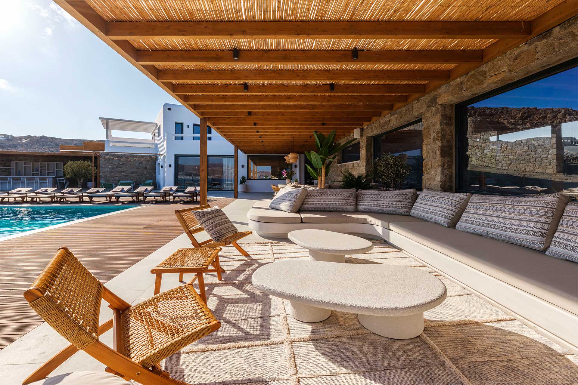 A heated infinity pool overlooks the iconic windmills, complemented by sun loungers, a lounge area, bar, and private gym. Outdoor dining and elegant relaxation spaces complete the experience.