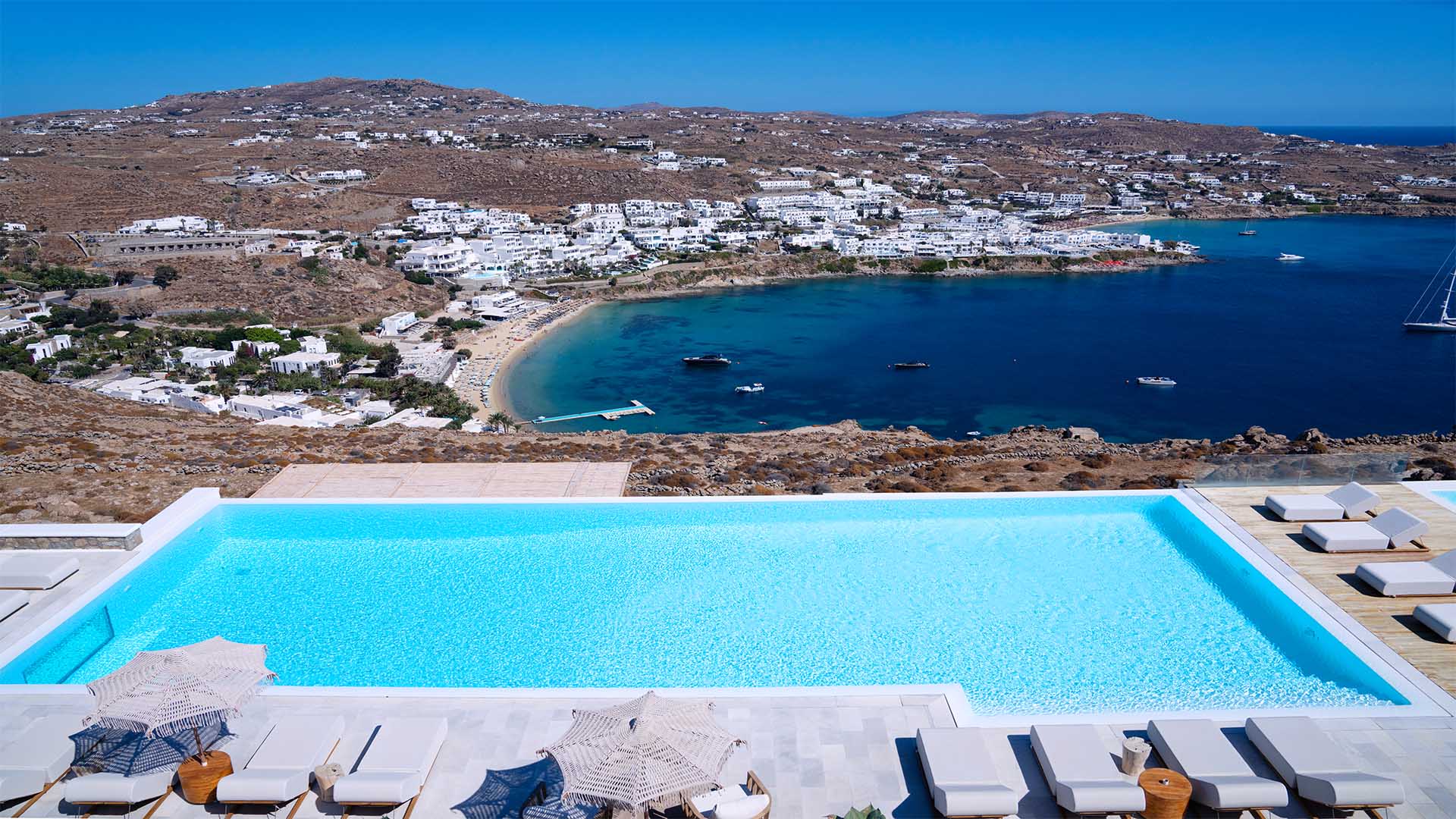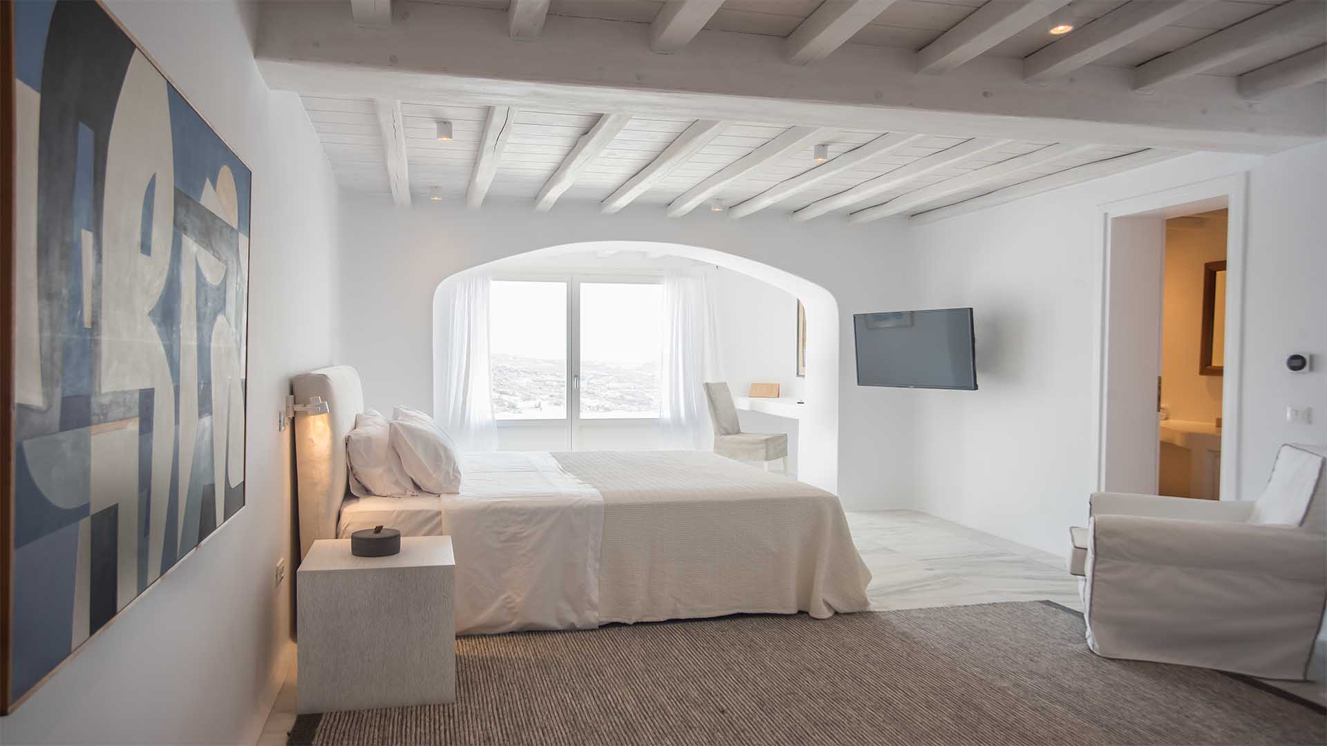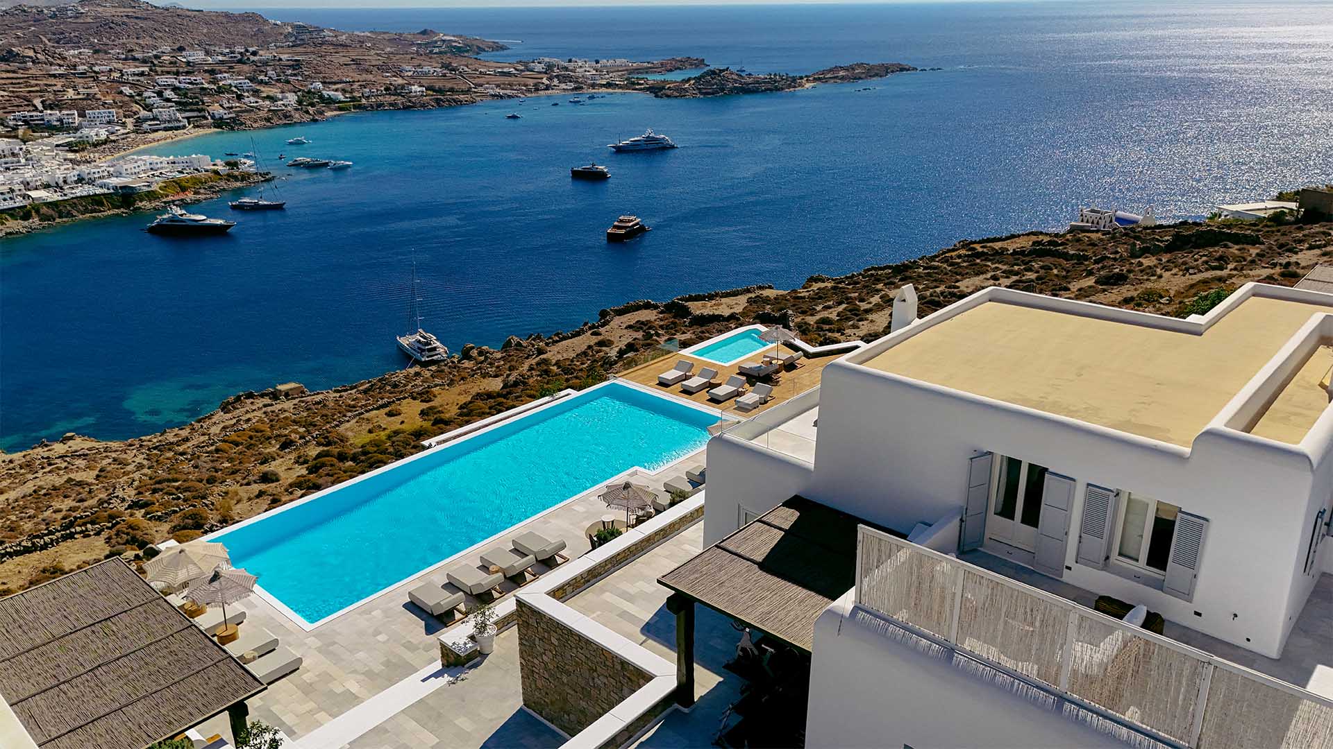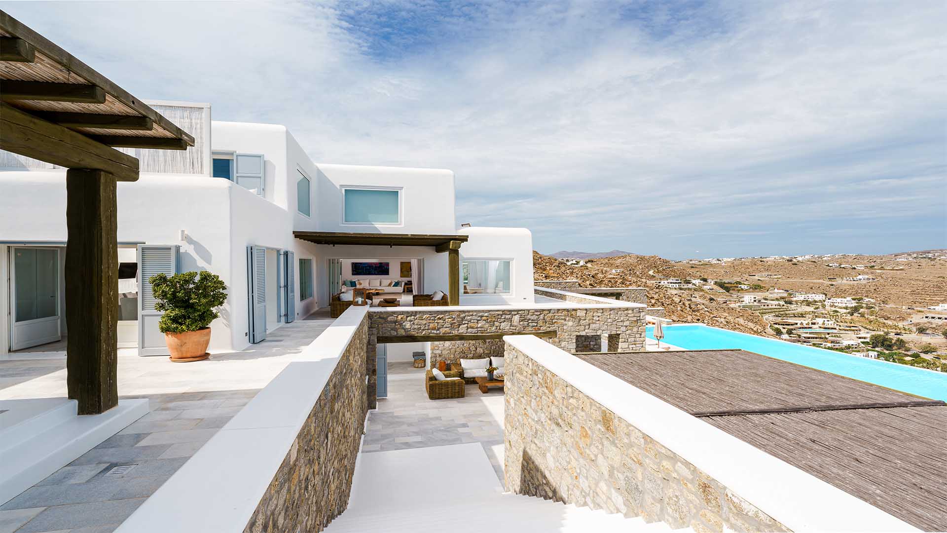 This superbly constructed property enjoys one of the most magnificent views in Mykonos, over the famous beach of Psarou, less than 3 kilometers from town center. Overhanging at the very edge of the rocky shore, the villa consists of spacious living areas and terraces with breathtaking view to the Cycladic islands and the Aegean sea. The infinity swimming pool area provides privacy and comfort to its guests where plenty of cozy corners create an unforgettable ambience. The white-washed interiors, decorated to the highest of standards, combine contemporary design with art and luxury. Villa Reina is an ultra exclusive estate, ideal for those who seek top quality time with family and friends.