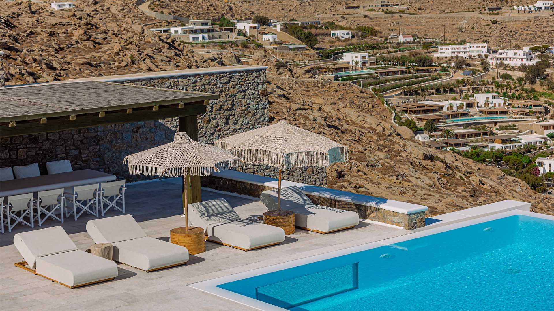 Pergola-covered lounges and dining areas